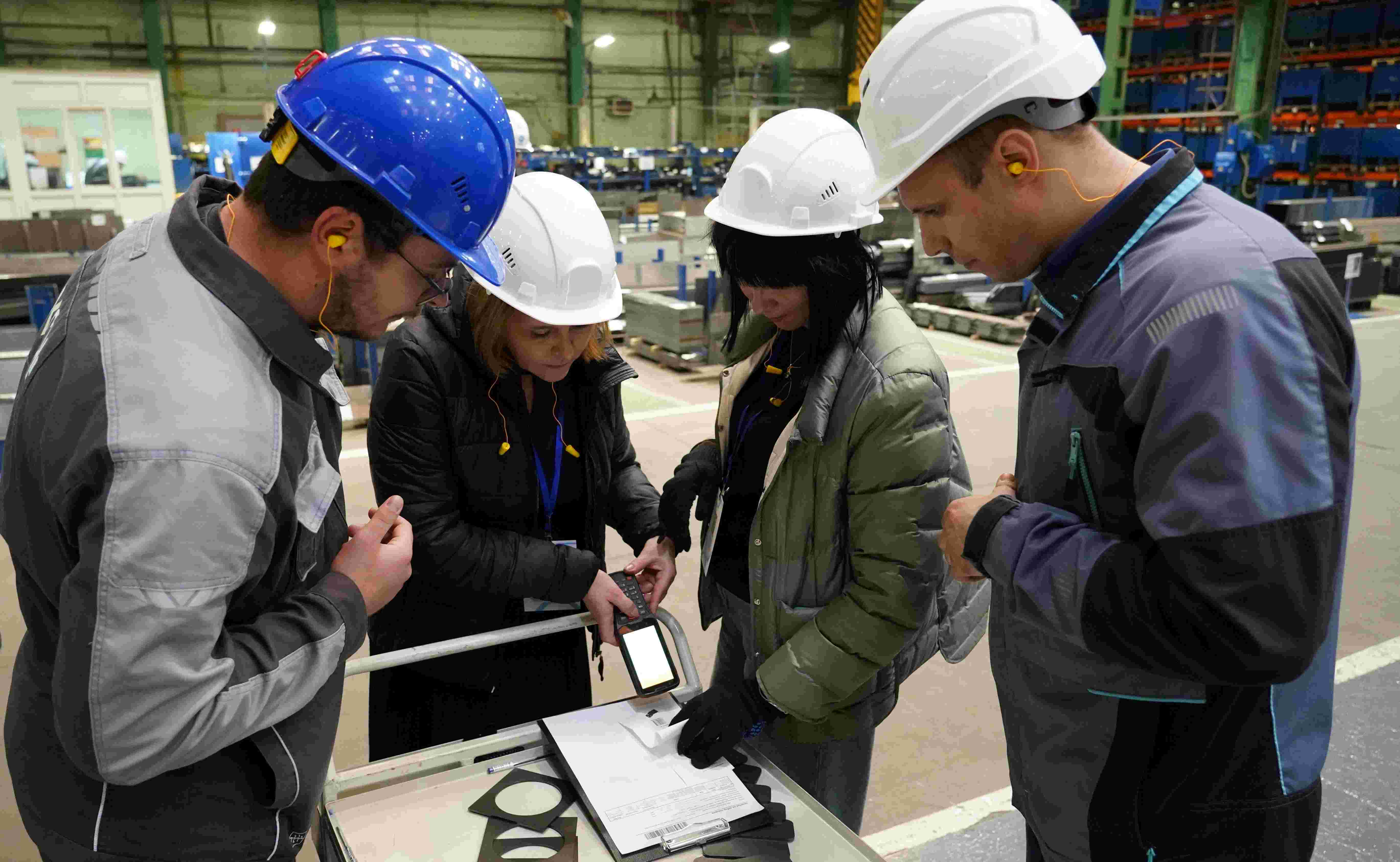 Фото 2. Евгений Маслов (крайний справа) и Николай Егоров (крайний слева) объясняют работу с ТСД (фото: отдел внешних коммуникаций ООО «ТМХ-Электротех»)