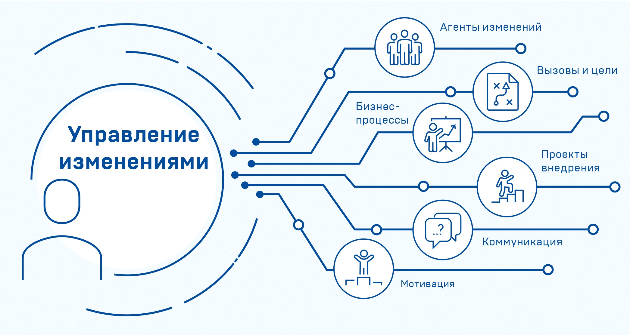 Когда мы говорим об управлении изменениями, то понимаем, что необходим комплексный подход к подготовке, поддержке и внедрению организационных трансформаций, сочетающий процессное и проектное управление с управлением рисками и целеполаганием.