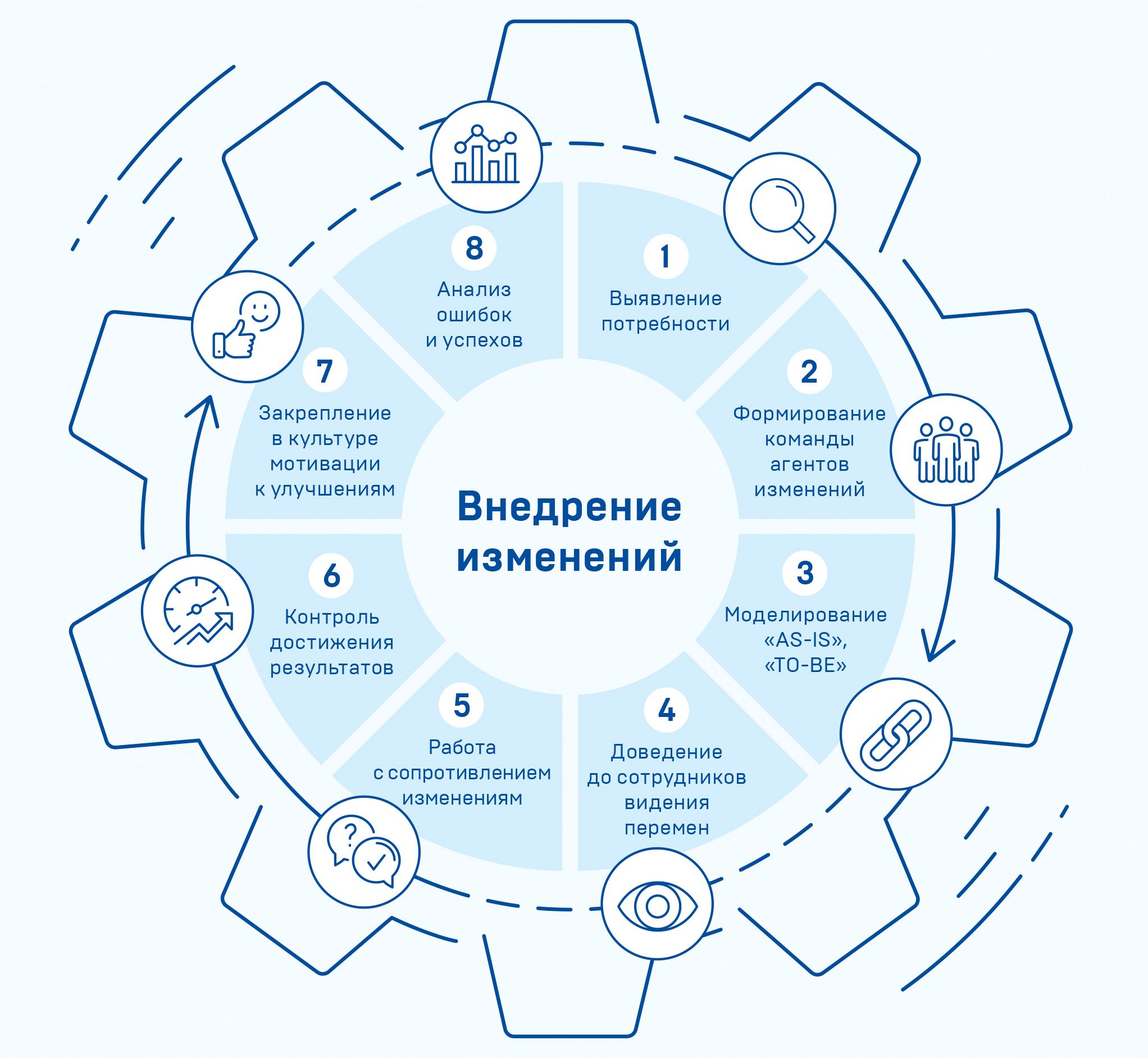 По мере развития процессной модели стало очевидно: даже качественно спроектированные процессы не внедряются автоматически. Любое изменение затрагивает привычные роли и вызывает естественное сопротивление.