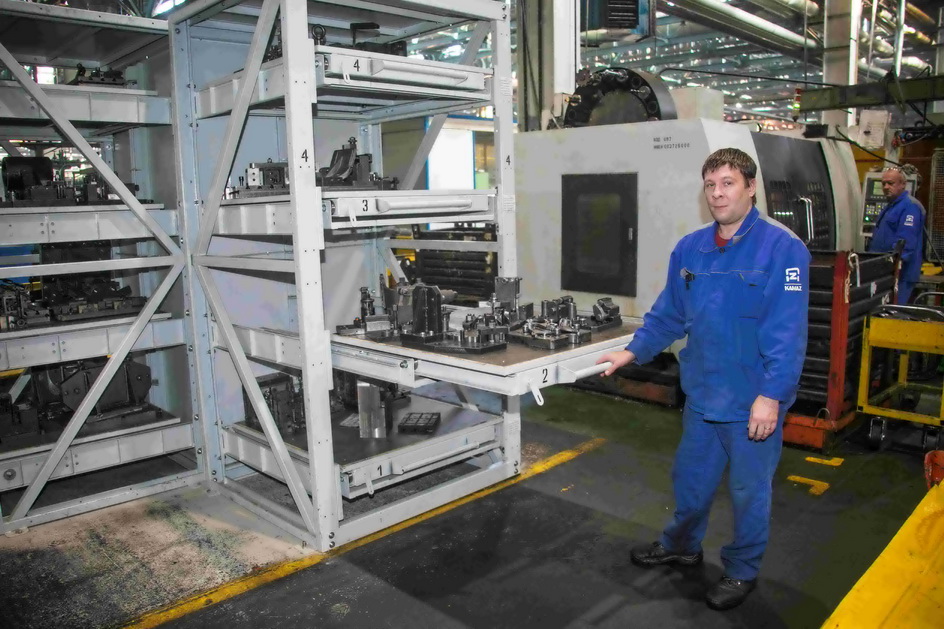 Тары с приспособлениями занимали в цехе площадь порядка 70-100 кв. метров, загромождали проходы. Найти варианты их оптимального размещения было непросто. Проблему помогли решить в отделе развития Производственной системы завода. Его руководитель Фанил Габбасов предложил установить для приспособлений специальные стеллажи с выкатанными полками, для размещения которых необходимо чуть больше квадратного метра. Идея была поддержана и руководством цеха, и Комитетом развития Производственной системы «КАМАЗа», он одобрил выделение средств на улучшение эргономики в цехе. При проведении процедуры закупки учитывалась надёжность стеллажей. Победил вариант с пятилетней гарантией.