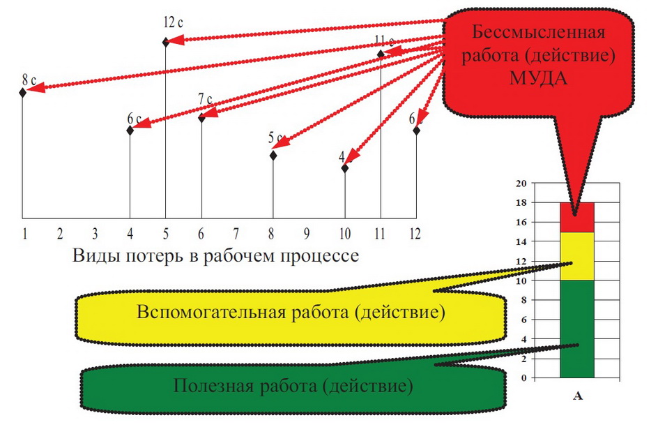 При выявлении потерь данные систематизируются для упрощения их обработки (пример диаграммы приведен на рисунке 1). Последующий анализ данной диаграммы позволяет определить потенциал роста производительности на конкретном рабочем месте за счет исключения бессмысленной работы и минимизации вспомогательной. По данным компании «Тойота» только рациональная организация рабочей зоны с последующей работой по системе 5S позволяет повысить производительность на 15-20%.