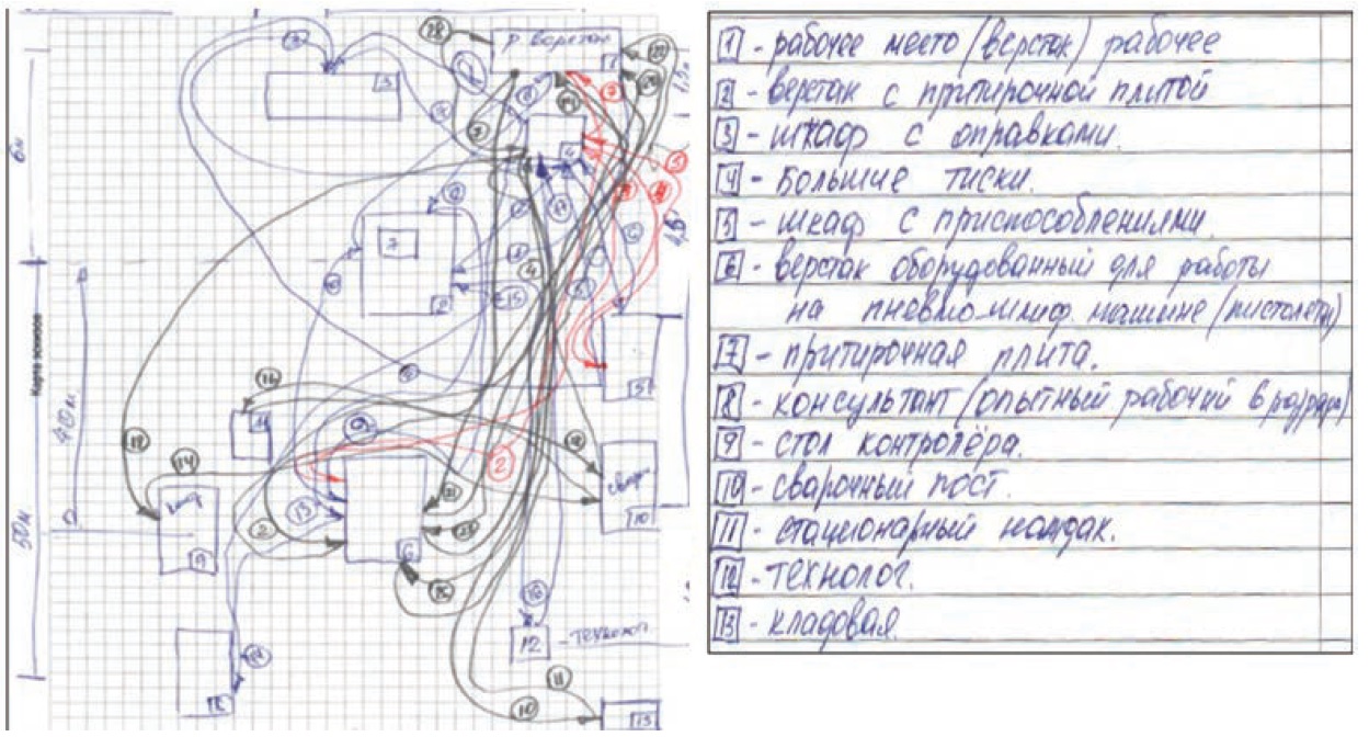 2. Предварительно изучается планировка рабочей зоны, подготавливается эскиз фактической рабочей зоны. Подготавливаются диаграммы перемещений рабочего и товарно-материальных ценностей (Диаграммы «спагетти», рис. 4).