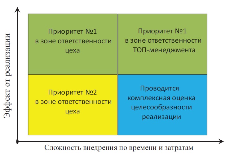 На данном этапе важно закрепить мысль, что работа не делается ради самой работы. Конечная цель – это добавочная стоимость, придаваемая продукту в процессе работы над ним на конкретном рабочем месте. При этом необходимо сопоставлять понесенные затраты и получаемую добавочную стоимость, за которую клиент готов заплатить. То есть на данном этапе мы подходим к оценке эффективности разработанных планов мероприятий путем сопоставления возможных выгод и затрат. Определяется приоритетность реализации подготовленных мероприятий по соотношению трех критериев: Время реализации, Затраты на реализацию, Ожидаемый эффект, при этом ряд мероприятий могут быть отклонены, как не эффективные.