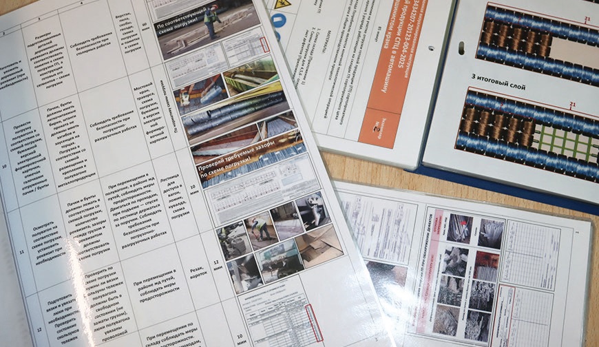 На основе переработанных схем погрузки в отделе организации бизнес-процессов создали производственные визуализированные инструкции (далее «ПВИ», на фото — ПВИ и инструкции к ним), чтобы сотрудникам участка складирования и отгрузки металлопродукции СПЦ было легче понять, как размещать в вагоне груз.