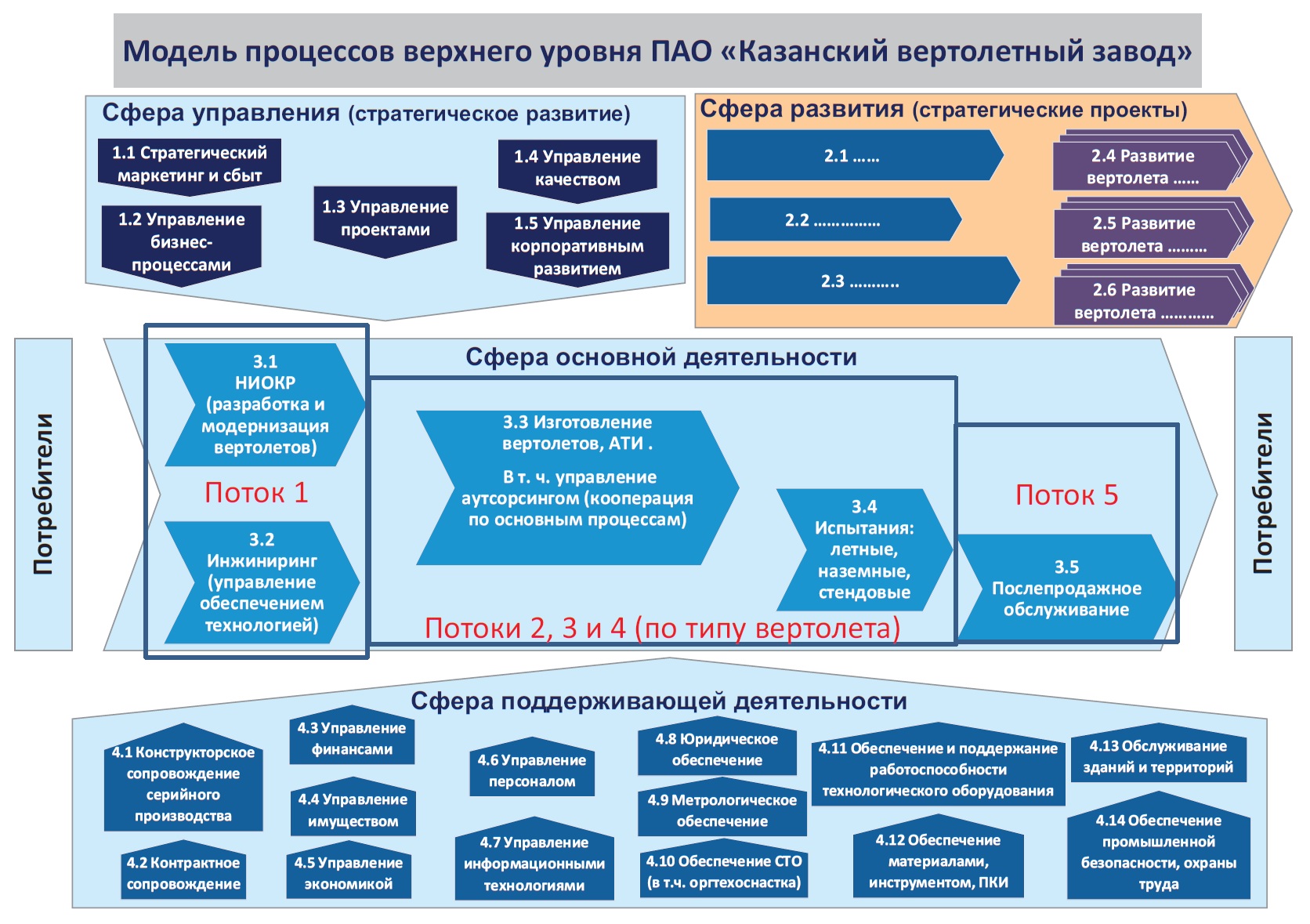 В ПАО «Казанский вертолетный завод», с точки зрения потока создания ценности, выделено два типа процессов: