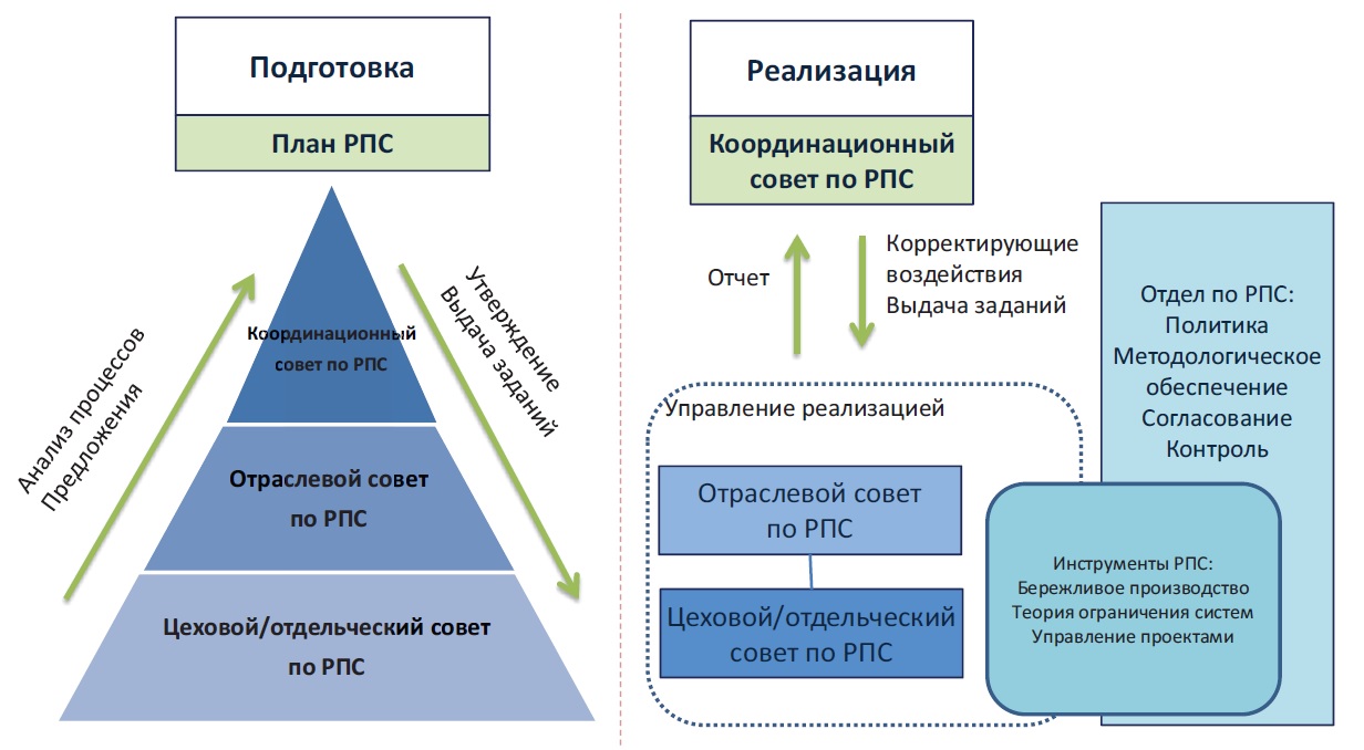 Управление «Планом РПС» осуществляется Координационным советом по развитию производственной системы предприятия под председательствованием первого заместителя генерального директора – заместителя генерального директора по научно-технической стратегии. Членами Координационного совета развития производственной системы предприятия являются ТОП-менеджеры и главные специалисты предприятия. Координационный совет ежемесячно проводит рассмотрение хода реализации плана РПС, на котором утверждаются корректирующие действия по реализации мероприятий, выдаются задания по проведению анализа процессов с последующим рассмотрением предложений по улучшениям для включения в план РПС. Укрупненно схема управления «Планом РПС» представлена на рис. 2.