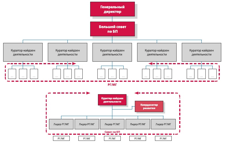 Для понимания и упрощения восприятия изложенной информации на рисунке 2 изображена действующая схема организационной иерархии Бережливого производства (БП) в целом и кайдзен-деятельности в частности.