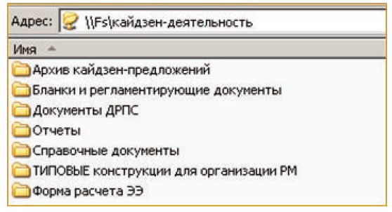 В обязанности лидеров групп входит необходимость публикации данных по своей группе в виде печатной таблицы из нескольких листов на стенде РГ. Таким образом, авторы получают обратную связь о статусе своих предложений, в том числе и о причинах их отклонения. Для офисных подразделений такая связь реализуется путем прямого доступа сотрудника, имеющего компьютер, к корпоративному сетевому ресурсу «Кайдзен-деятельность». На рисунке 4 представлена структура сетевого ресурса.