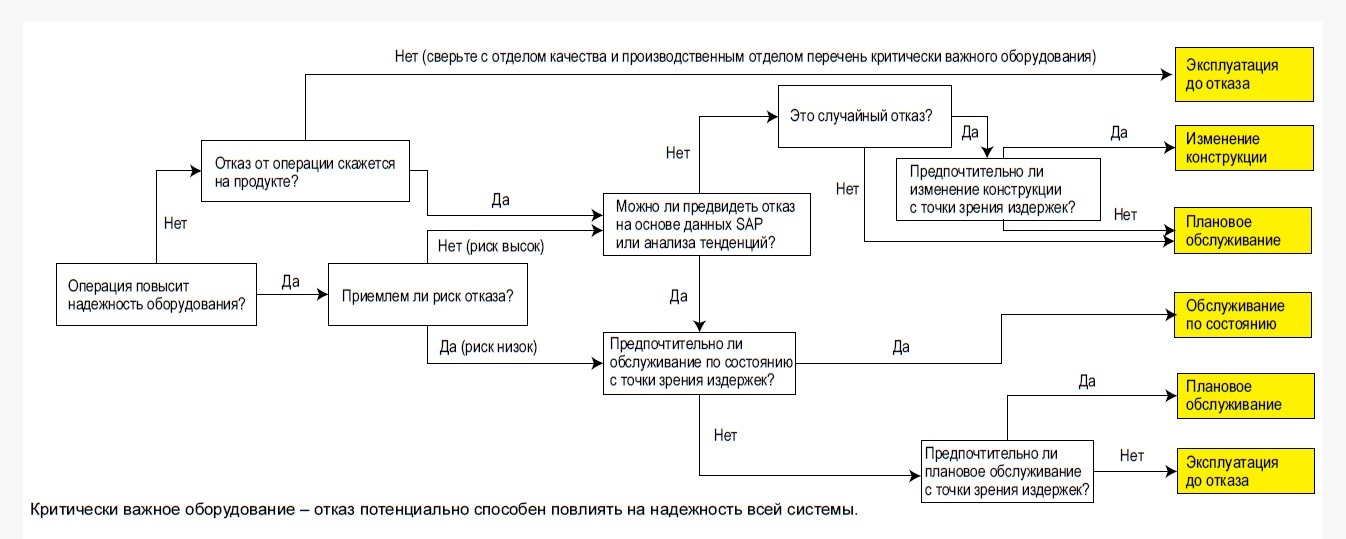 Использование диаграммы принятия стратегических решений (рис. 1) позволяет добиться единого, стандартного подхода к обслуживанию всего оборудования. Она дает возможность технику или инженеру по ТО выбрать одну из следующих стратегий: