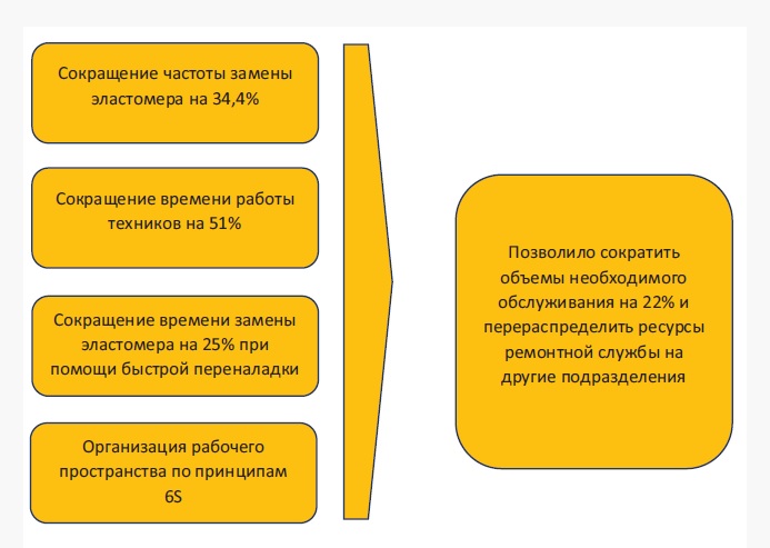 Переоценка принятых практик и подходов к техническому обслуживанию и ремонту, устранение ненужных операций и дублирующих функций, внедрение 6S, SMED, инструментов оценки и анализа операций позволили не только повысить эффективность технического обслуживания и сократить затраты компании, но и постепенно привели к изменению производственной культуры всего предприятия и повсеместному внедрению принципов непрерывного совершенствования.