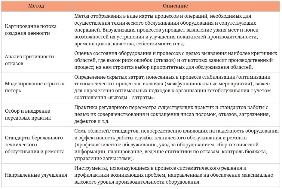 Таблица 2. Методы и практики, используемые в бережливом техническом обслуживании и ремонте.