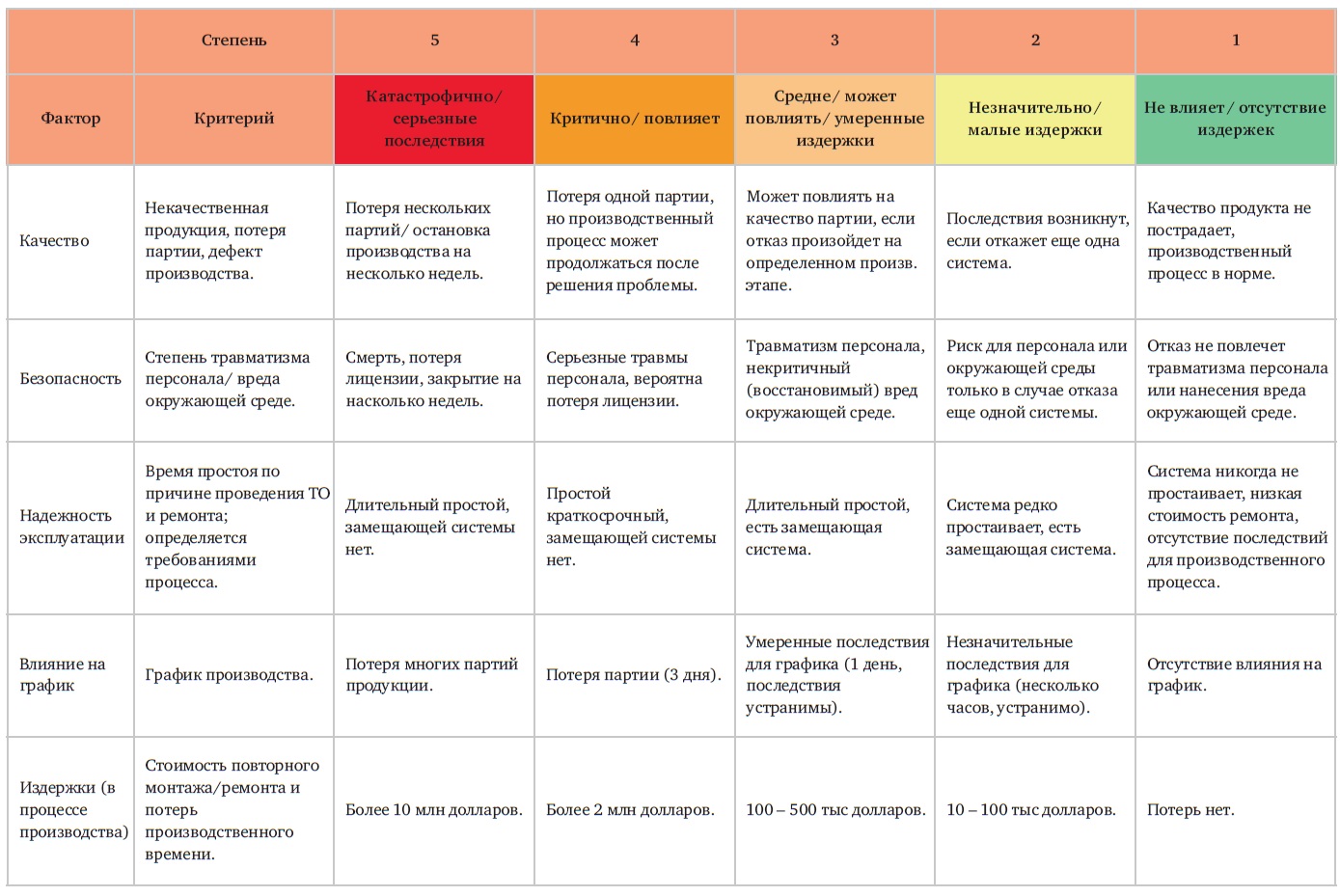 Анализ критичности оборудования – качественная и всесторонняя оценка последствий отказа оборудования для качества продукции, безопасности персонала, времени простоя оборудования, издержек и общего функционирования предприятия. Такая оценка позволяет определить важность функционирования оборудования или системы для производственного процесса. В Таблице 3 приведен механизм определения критичности различного оборудования в компании Grange Castle.